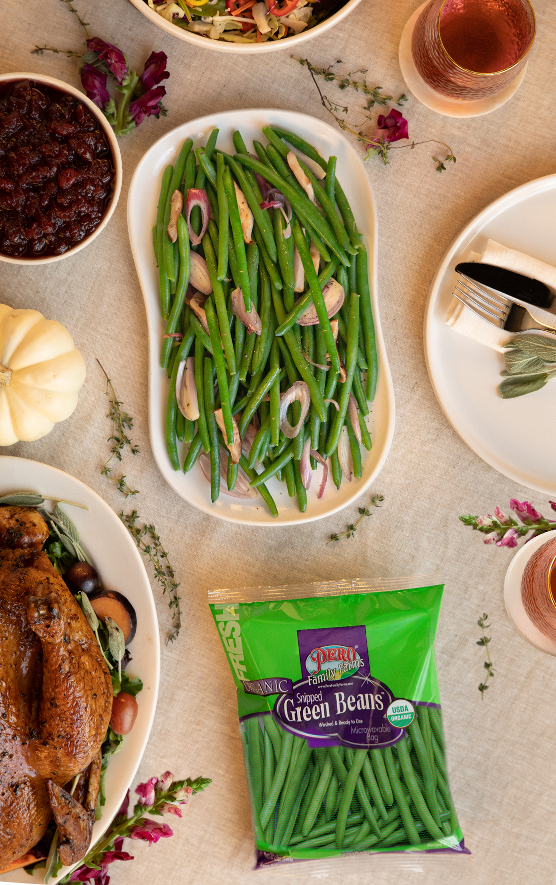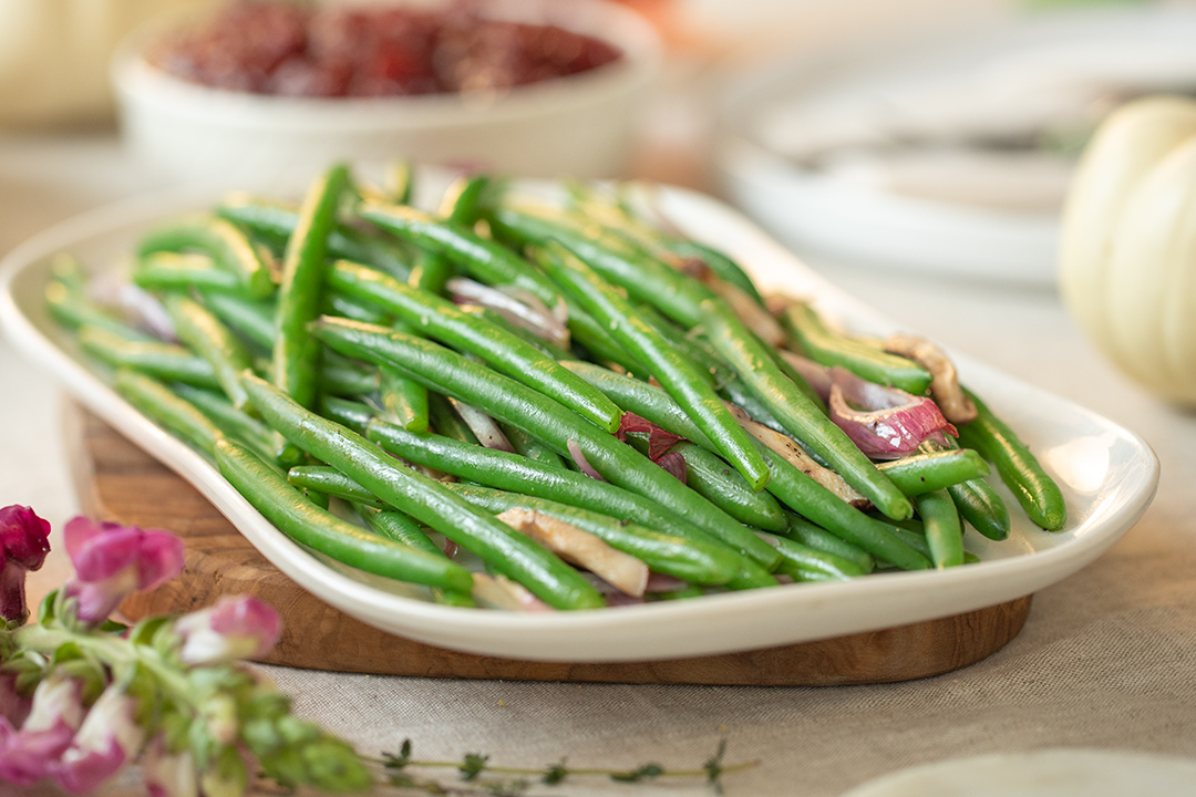 Bring fresh flavor to your Thanksgiving table with this lighter take on a holiday classic! Pero Family Farms Snipped Green Beans with shiitake mushrooms and sautéed onions create a simple yet savory side dish that’s bursting with farm-fresh goodness and festive flair.